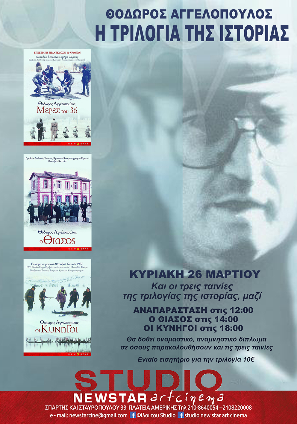 Ο Θόδωρος Αγγελόπουλος (27 Απριλίου 1935- 24 Ιανουαρίου 2012) υπήρξε ο σημαντικότερος, ίσως, κινηματογραφιστής που ανέδειξε η χώρα μας και ένας από τους σπουδαιότερους του παγκόσμιου κινηματογράφου. Στον κινηματογράφο Studio new star θα προβληθούν στις 26 Μαρτίου τα τρία εμβληματικά έργα του «Ο θίασος«, «Μέρες του ‘36» και «Κυνηγοί». Σε όσους θεατές δουν  και τις τρεις ταινίες μαζί, θα δοθούν και δώρα.